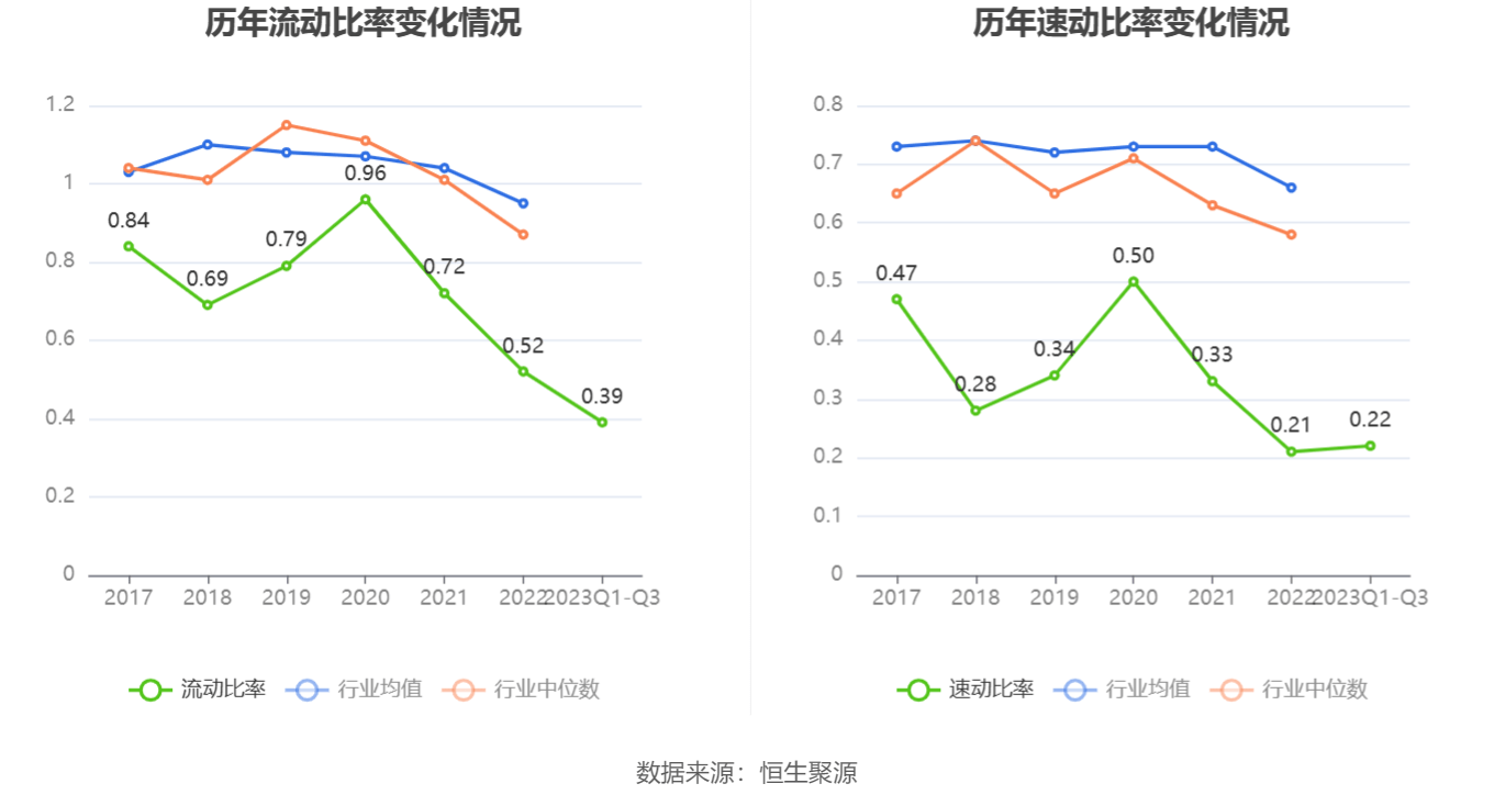 2023年前三季度,公司流动比率为0.39,速动比率为0.22。