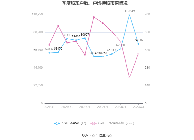 筹码集中度方面,截至2023年三季度末,公司股东总户数为7.4万户,较上半年末下降了3.62万户,降幅32.84%;户均持股市值由上半年末的204.81万元上升至394.65万元,增幅为92.69%。