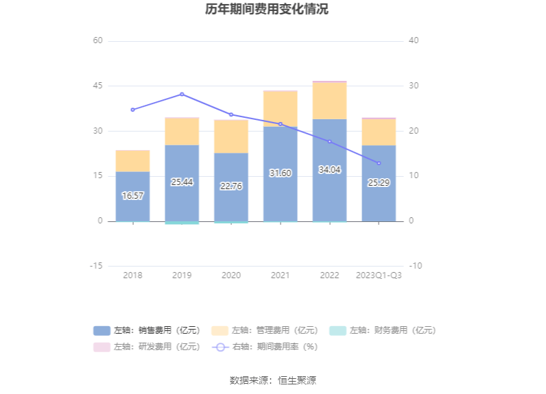 2023年前三季度,公司期间费用为34.49亿元,较上年同期减少4.26亿元;期间费用率为12.90%,较上年同期下降4.60个百分点。其中,销售费用同比下降17.21%,管理费用同比增长7.64%,研发费用同比增长37.95%,财务费用由去年同期的-2632.04万元变为-329.87万元。