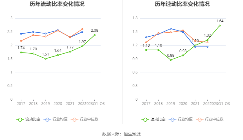 2023年前三季度,公司流动比率为2.38,速动比率为1.64。