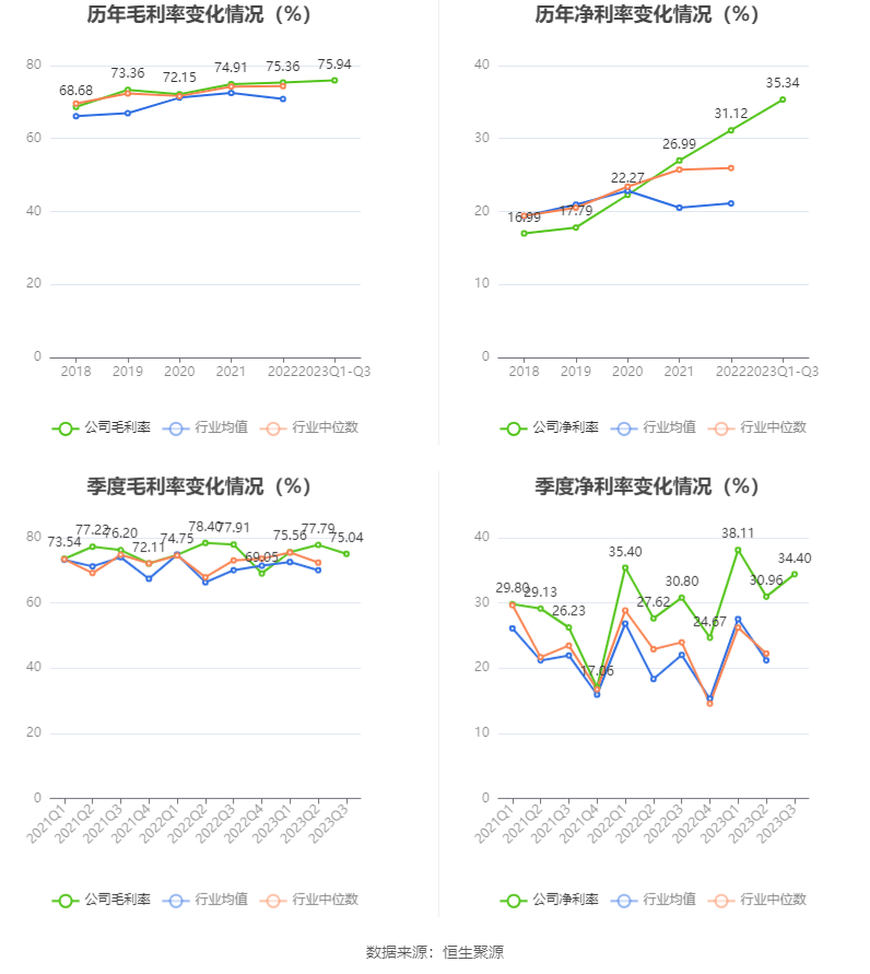 2023年前三季度,公司毛利率为75.94%,同比下降0.58个百分点;净利率为35.34%,较上年同期上升3.04个百分点。从单季度指标来看,2023年第三季度公司毛利率为75.04%,同比下降2.87个百分点,环比下降2.75个百分点;净利率为34.40%,较上年同期上升3.60个百分点,较上一季度上升3.44个百分点。