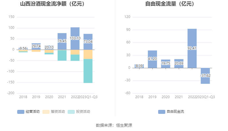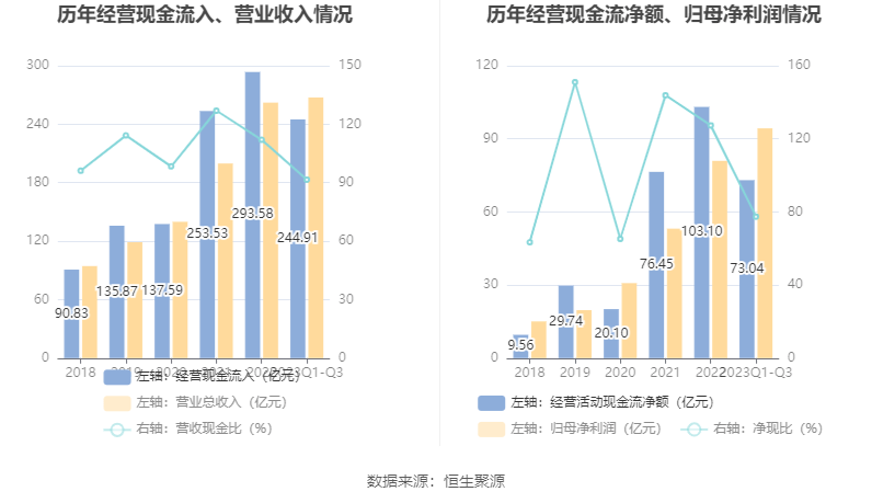 2023年前三季度,公司经营活动现金流净额为73.04亿元,同比下降10.29%;筹资活动现金流净额-42.25亿元,同比减少20.38亿元;投资活动现金流净额-110.45亿元,上年同期为-78.14亿元。
