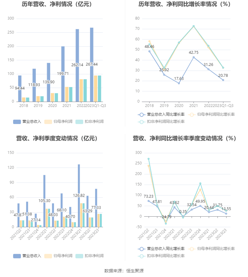 根据三季报,公司第三季度实现营业总收入77.33亿元,同比增长13.55%,环比增长22.19%;归母净利润26.64亿元,同比增长27.12%,环比增长36.74%;扣非净利润26.68亿元,同比增长27.33%,环比增长37.09%。
