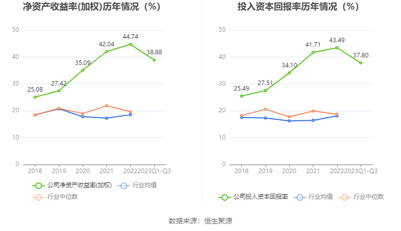 数据显示,2023年前三季度公司加权平均净资产收益率为38.88%,较上年同期下降0.97个百分点;公司2023年前三季度投入资本回报率为37.80%,较上年同期下降1.54个百分点。