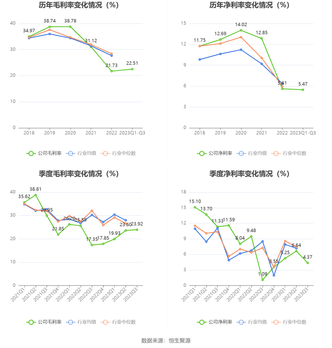 2023年前三季度,公司毛利率为22.51%,同比下降0.68个百分点;净利率为5.47%,较上年同期下降0.92个百分点。从单季度指标来看,2023年第三季度公司毛利率为23.92%,同比上升6.57个百分点,环比上升0.32个百分点;净利率为4.37%,较上年同期上升3.28个百分点,较上一季度下降2.27个百分点。