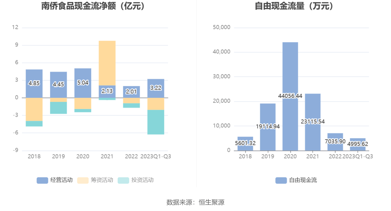 2023年前三季度,公司经营活动现金流净额为3.22亿元,同比增长343.89%,主要系年初至报告期末销售商品和提供劳务收到的现金较上期同期增加;同时因原材料价格下降导致支付采购货款减少;筹资活动现金流净额-2.06亿元,同比减少7002.83万元;投资活动现金流净额-4.20亿元,上年同期为-4909.2万元。