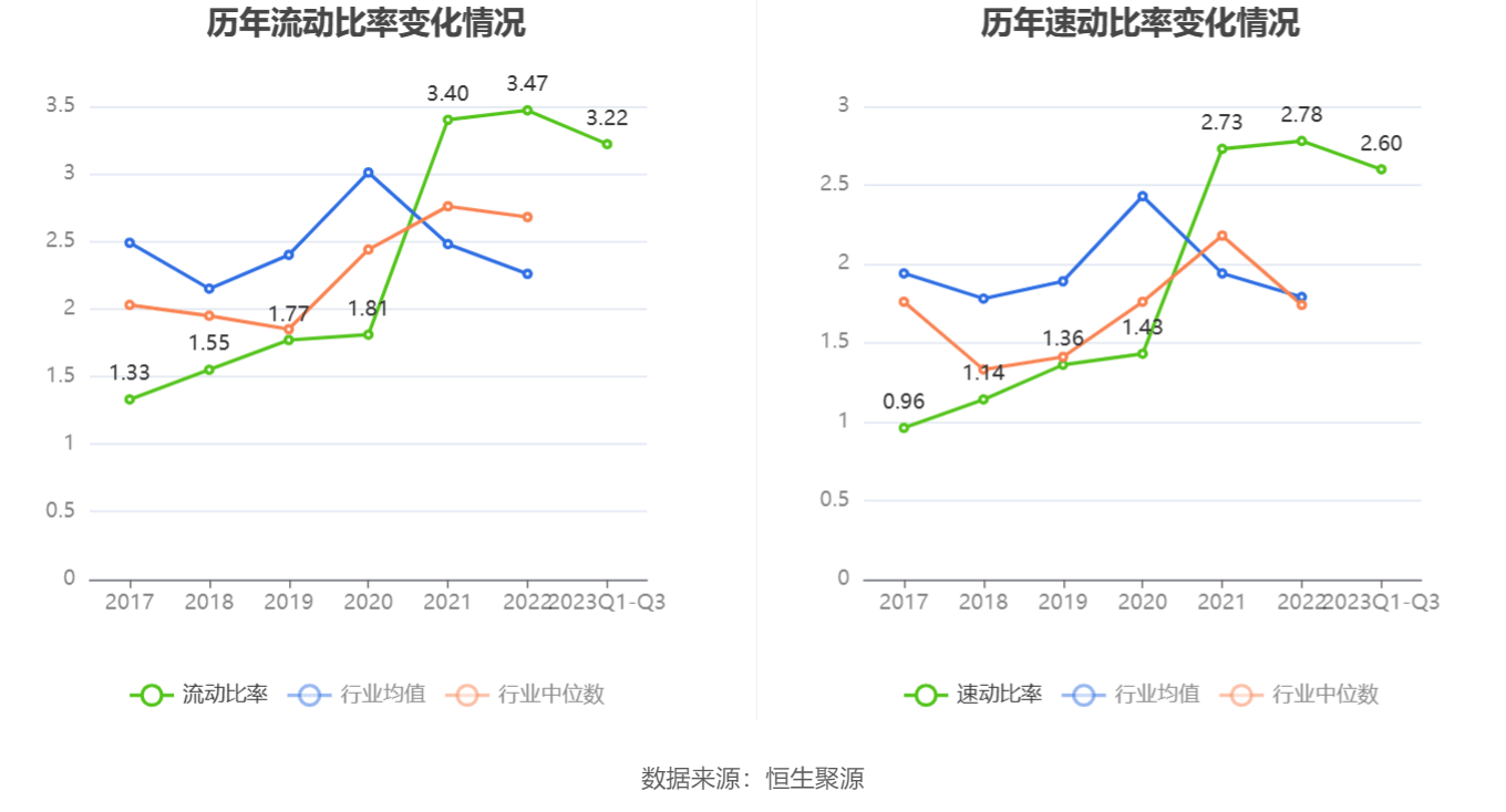 2023年前三季度,公司流动比率为3.22,速动比率为2.60。