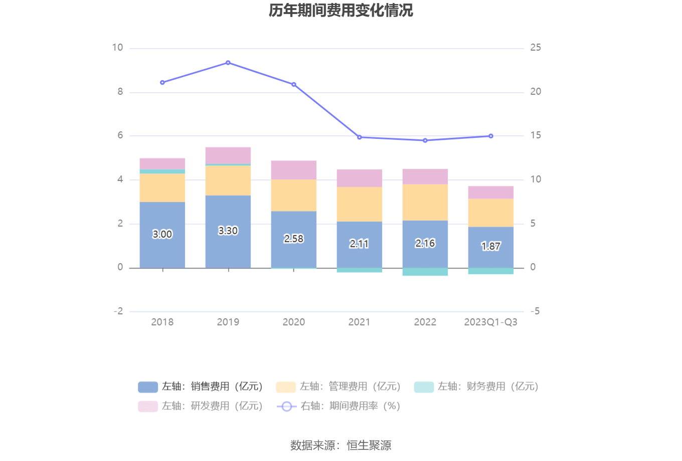 2023年前三季度,公司期间费用为3.44亿元,较上年同期增加3430.99万元;期间费用率为15.00%,较上年同期上升0.13个百分点。其中,销售费用同比增长14.94%,管理费用同比增长9.1%,研发费用同比增长3.95%,财务费用由去年同期的-2644.16万元变为-2929.05万元。