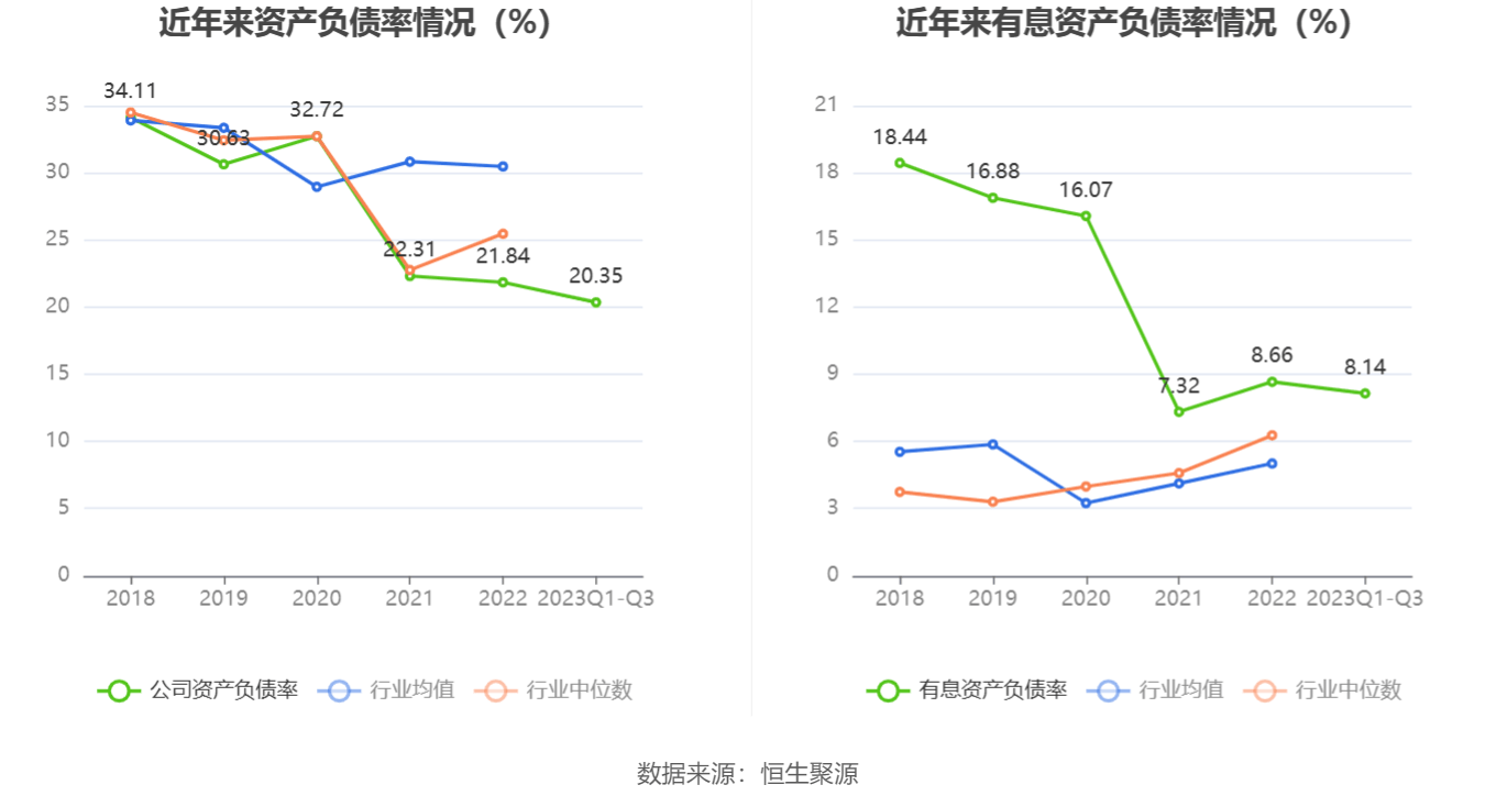 在偿债能力方面,公司2023年三季度末资产负债率为20.35%,相比上年末下降1.49个百分点;有息资产负债率为8.14%,相比上年末下降0.52个百分点。