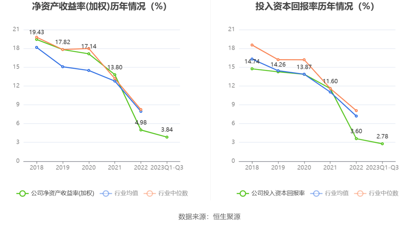 数据显示,2023年前三季度公司加权平均净资产收益率为3.84%,较上年同期下降0.27个百分点;公司2023年前三季度投入资本回报率为2.78%,较上年同期下降0.31个百分点。
