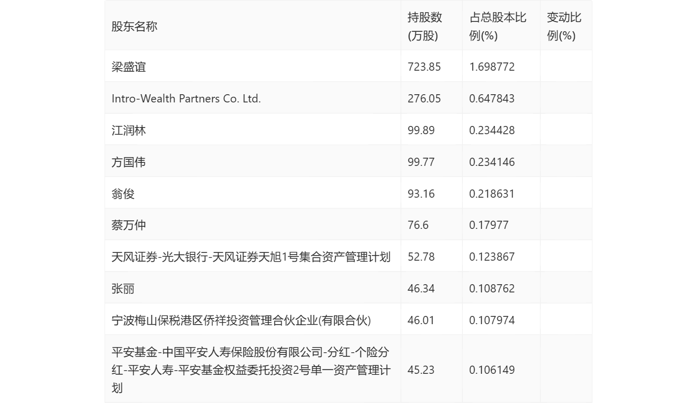 三季报显示,2023年三季度末公司十大流通股东中,新进股东为张丽,取代了上半年末的财通资管消费升级一年持有期混合型证券投资基金。在具体持股比例上,梁盛谊、Intro-Wealth Partners Co. Ltd.、江润林、方国伟、翁俊、天风证券-光大银行-天风证券天旭1号集合资产管理计划、宁波梅山保税港区侨祥投资管理合伙企业(有限合伙)、平安基金-中国平安人寿保险股份有限公司-分红-个险分红-平安人寿-平安基金权益委托投资2号单一资产管理计划持股有所上升,蔡万仲持股有所下降。