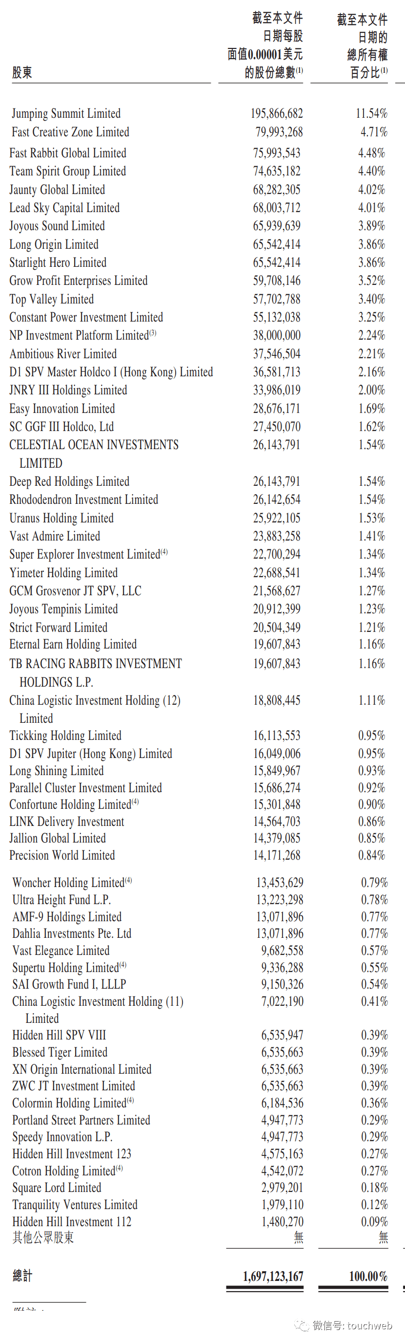 IPO后,李杰透过Jumping Summit Limited持股为11.11%,腾讯持股为6.07%,博裕资本持股为5.88%,ATM持股为5.29%,D1持股为2.99%,高瓴投资持股为1.93%,GLP持股为1.92%;