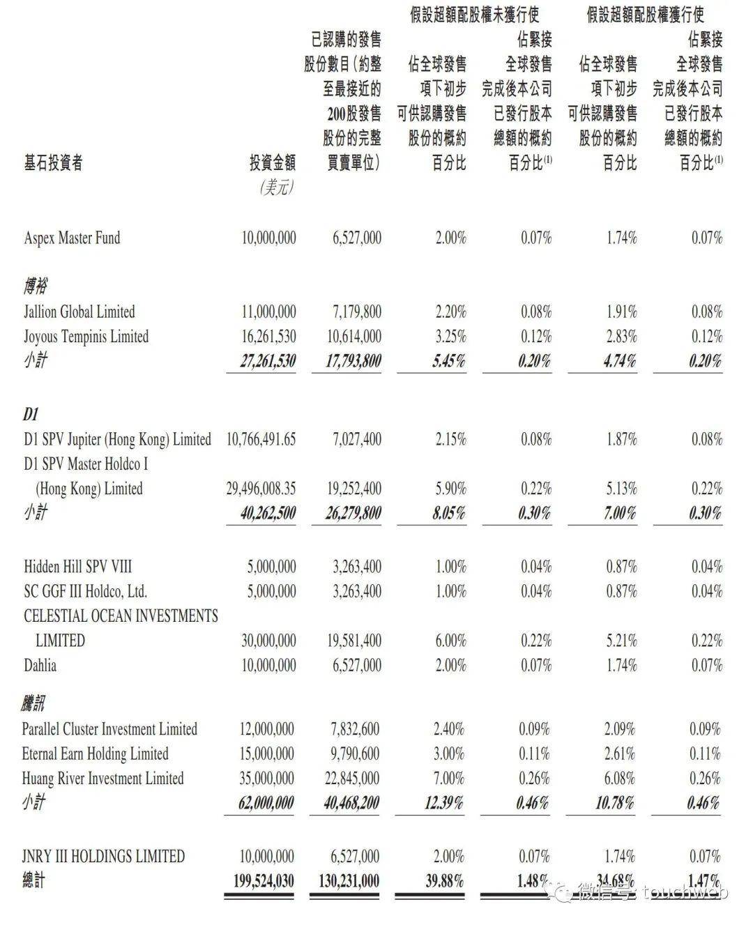极兔此次上市的基石投资者包括腾讯、博裕、D1、红杉、淡马锡、Aspex等,一共认购总额约2亿美元。