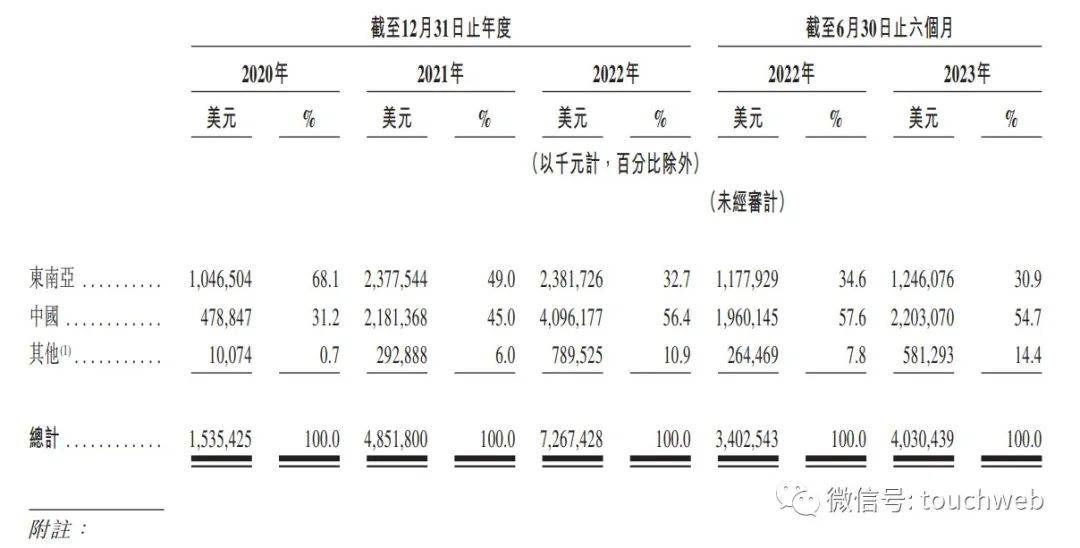 极兔2023年上半年来自东南亚的收入为12.46亿美元,占比30.9%;来自中国的收入22亿美元,占比54.7%;来自其他地区收入为5.81亿美元,占比为14.4%。