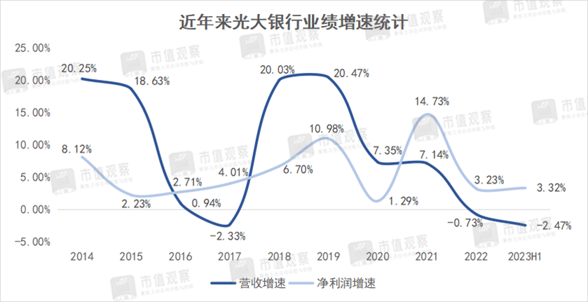 从营收角度看,光大银行的营收增速自2019年便不断下滑,到2023年上半年便陷入-2.47%的负增长。这样的增速更是创出了近10年来的新低。