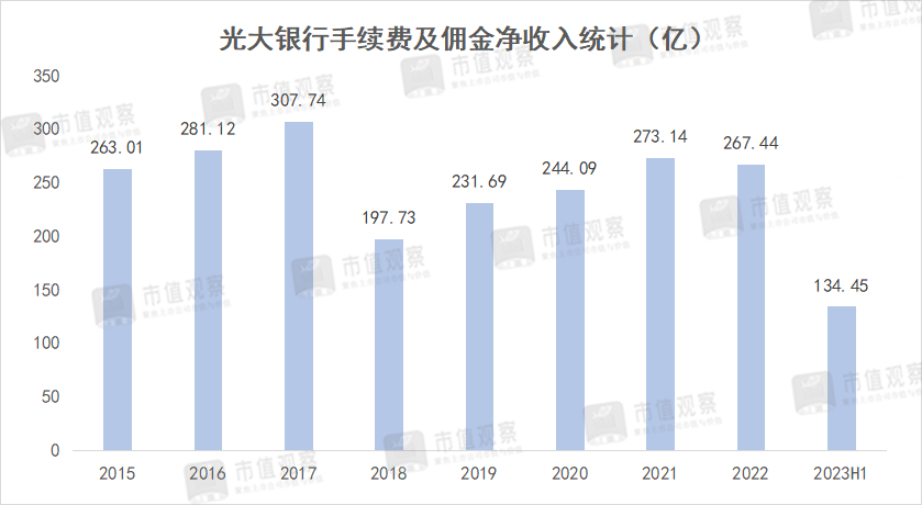 对于光大银行整体的手续费中间收入,自2018年大幅下跌后就一直处在恢复状态,离2017年前期307.74亿高点还有不少差距,对公司营收的贡献程度也相对较弱。