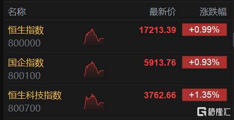 格隆汇10月27日丨港股上午盘三大指数集体上涨,恒生科技指数一度冲高至2.2%,午间收涨1.35%,恒指、国指分别上涨0.99%和0.93%,恒指再度重返万七关口。