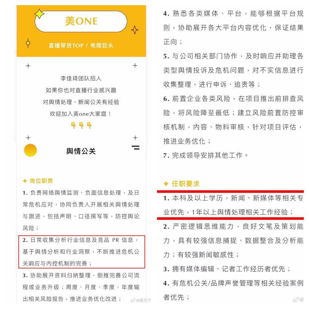 根据李佳琦所属公司美One发布的招聘信息显示,这个职务的工作内容包括日常收集分析行业信息及竞品 PR 信息,基于舆情分析和行业洞察,不断推进危机公关响应与内控机制的完善。