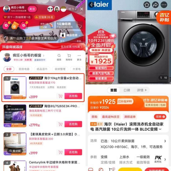 真便宜还是假便宜,价格比对一目了然。10月26日下午,疯狂小杨哥的直播间中,一款海尔洗烘一体滚筒洗衣机售价2099,小杨哥称确认收货后自己会补贴粉丝现金170元,也就意味着这款洗衣机最终售价为1929元。同一时段,京东平台上一家京喜直营店售卖的同款产品,在百亿补贴后售价为1925元。