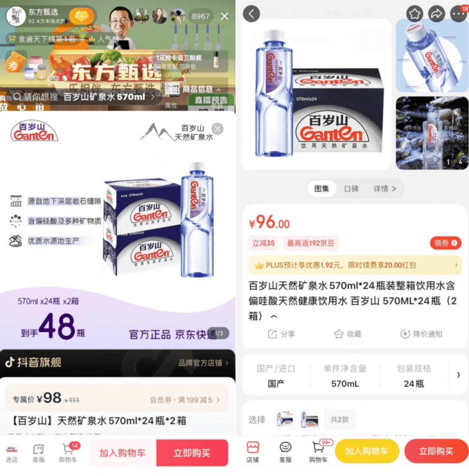 10月8日,东方甄选直播间售卖的【百岁山】天然矿泉水570ml*24瓶*2箱,价格为98元,京东平台上一家4星的三方店(马仁食品专营店),售卖同规格产品的价格为96元。金泰康的草本足浴包30g*30包/袋,在东方甄选直播间价格为29.9元,京东平台上一家三方店售价为28.7元。