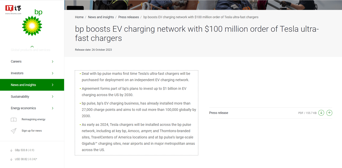 IT之家 10 月 27 日消息,英国石油公司(BP)的电动汽车充电器部门正在订购价值 1 亿美元的特斯拉超快速充电器,以便在美国推出,这是特斯拉充电器首次在独立国家部署。
