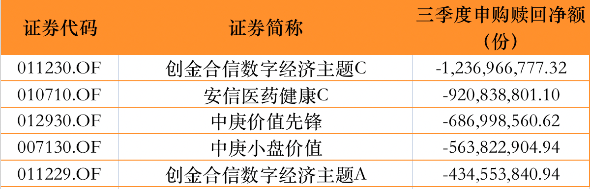 此外,混合型基金中三季度净赎回份额排名居前的产品分别是:泓德瑞兴三年持有、浦银安盛量化多策略C、招商瑞文A、华夏新锦顺A和嘉实新财富,三季度份额净赎回均在10亿份以上,分别遭净赎回20.65亿份、17.75亿份、14.23亿份、14.08亿份和12.66亿份。