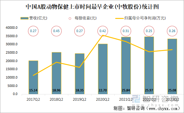 2023年二季度中国A股动物保健上市公司中,截至2023年9月7日14:00,1999年1月7日上市的中牧股份上市时间最早距今约24年,从近几年二季度营收与净利润来看,2022Q2营收最高,有25.97亿元。