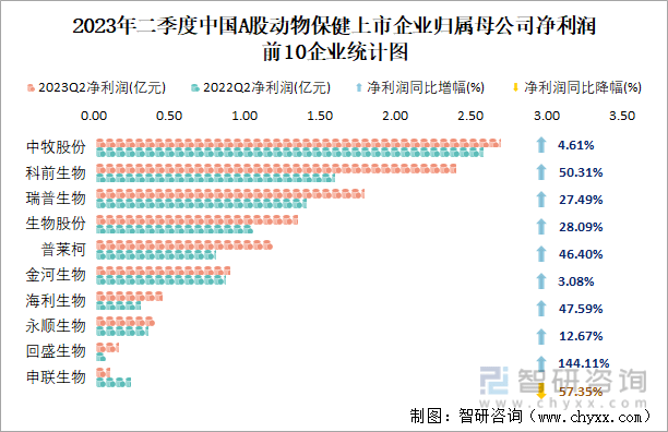 2023年二季度中国A股动物保健上市公司中,中牧股份归属母公司净利润最高,有2.69亿元,净利润增速为4.61%,净利润排名前十的企业中1家企业同比有所下滑。动物保健净利润同比增幅最大企业为回盛生物,增速为144.11%。