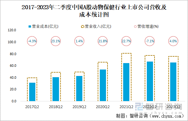 2017-2023年二季度中国A股动物保健行业上市公司营收及成本统计图