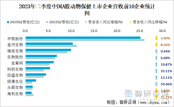 2023年二季度中国A股动物保健上市企业营收前10企业统计图