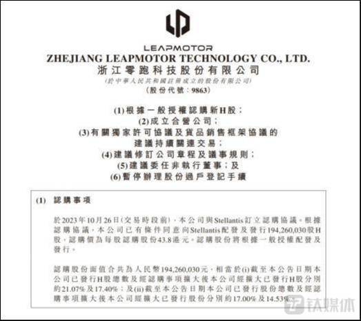 根据认购协议,将向Stellantis集团配发及发行1.94亿股H股,认购价为每股认购股份43.8港元,较前一个交易日(10月25日)收盘价36.8港元溢价19.02%。认购事项的所得款项总额将为85亿港元,拟分配用于研发投资、营销、提升生产能力以及运营资金及一般公司用途等用途。