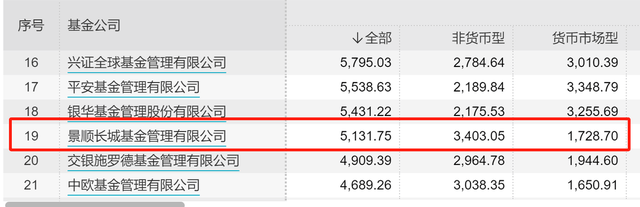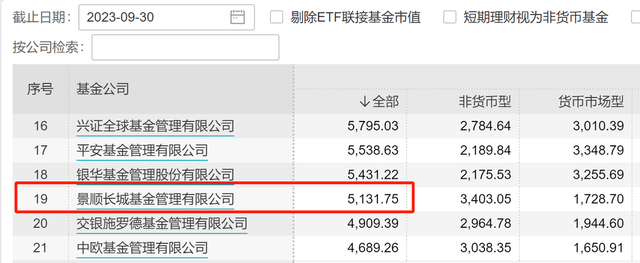 Wind数据显示,2023年三季度末,景顺长城基金非货币基金规模为3403.05亿元,货币基金规模为1728.70亿元。2023年二季度末,景顺长城基金非货币基金规模为3566.10亿元,货币基金规模为1802.33亿元。