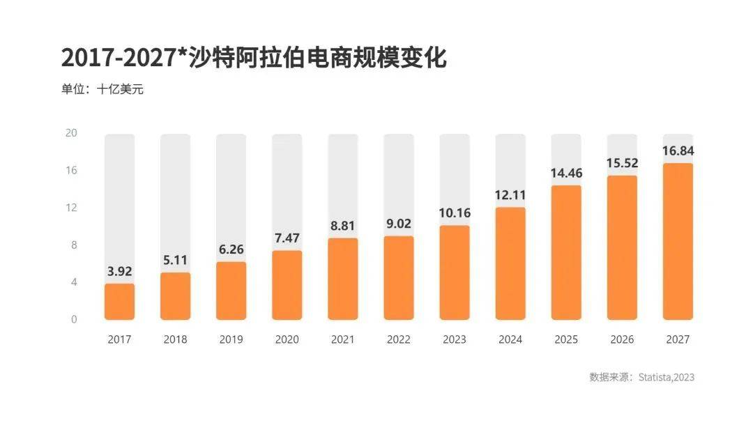 根据沙特商务部的商业公告,2023年第一季度,沙特的电子商务呈现显著增长,增幅超过32%。第二季度,沙特的电商企业注册总量达到了35314家,较去年同期的29007家增长了21%。受益于电商的发展,物流行业也同步提升,仅仅在第二季度,沙特注册的物流公司数量就达到了4288家,较去年同期增长了83%。根据Statista数据显示,预计到2027年,沙特阿拉伯的电子商务市场规模将达到168.4亿美元。
