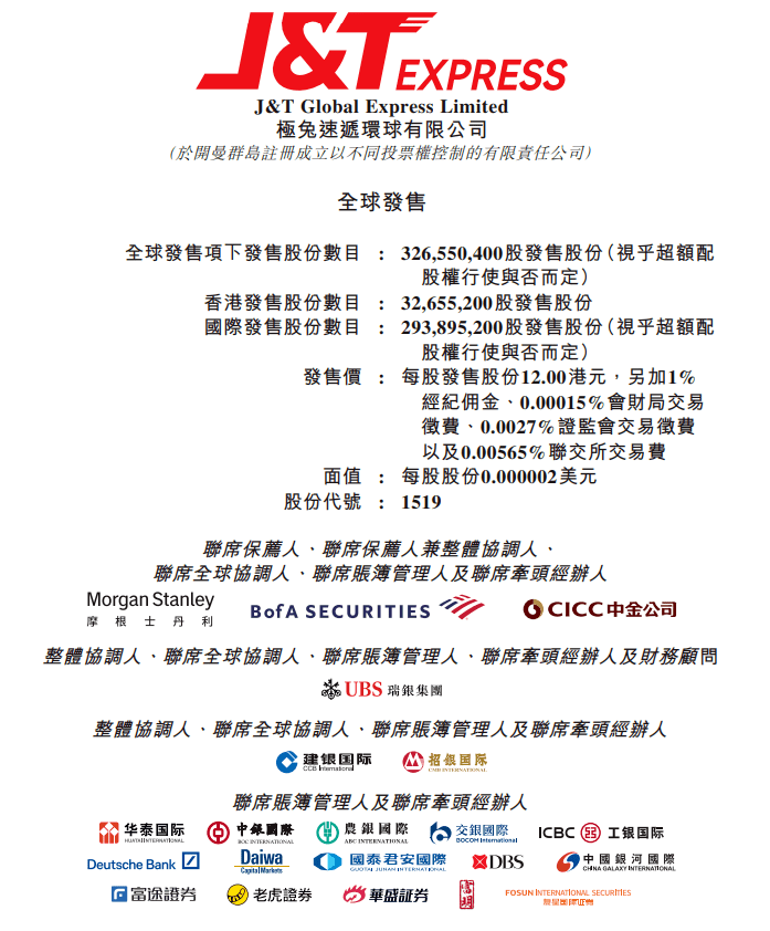 这次极兔速递计划全球发售约3.266亿股股份,其中约2.939亿股将作为国际发售,约3265.52万股将作为香港发售,发行价为每股12.00港元。
