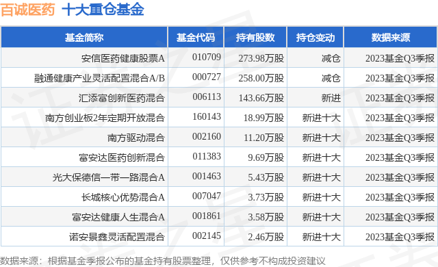 根据2023基金Q3季报公募基金重仓股数据,重仓该股的公募基金共11家,其中持有数量最多的公募基金为安信医药健康股票A。安信医药健康股票A目前规模为21.6亿元,最新净值1.1003(10月26日),较上一交易日上涨0.81%,近一年下跌14.92%。该公募基金现任基金经理为池陈森。