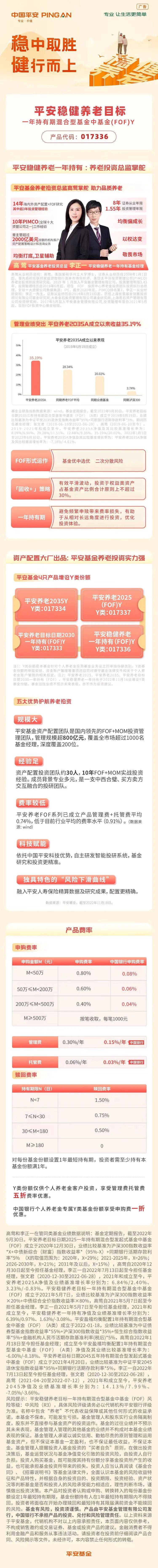 在投研方面,平安基金已建立健全并有效执行适应个人养老金业务的投资研究制度和流程,养老目标日期基金将根据资产下滑曲线进行资产配置,养老目标风险基金严格遵循既定风险目标,控制基金下行风险。该公司采用成熟稳健的资产配置策略,追求基金资产长期稳健增值。