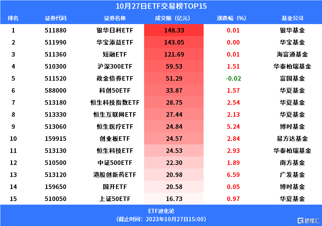 今日交易榜前三依旧为银华日利ETF、华宝添益ETF和海富通基金短融ETF,已是连续三日三只ETF成交额均破百亿。今日港股医药股大涨,相关ETF交易额明显增加,博时基金恒生医疗ETF、广发基金港股创新药ETF成交额分别为24.84亿元、20.98亿元,新晋上榜。