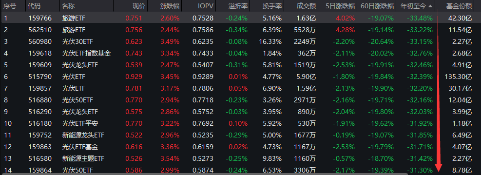 另一种策略,是相对谨慎的抄底策略。也就是选择前期跌幅较大,目前还没有明显涨幅的ETF产品。这其实就是一种博反弹的操作。比如光伏赛道相关ETF,可以说是今年整体表现欠佳的产品,普遍年内跌幅超过30%。当然,从年内表现靠后的赛道来看,还有两只旅游ETF,也是今年跌幅较大的两只产品,同样值得关注。