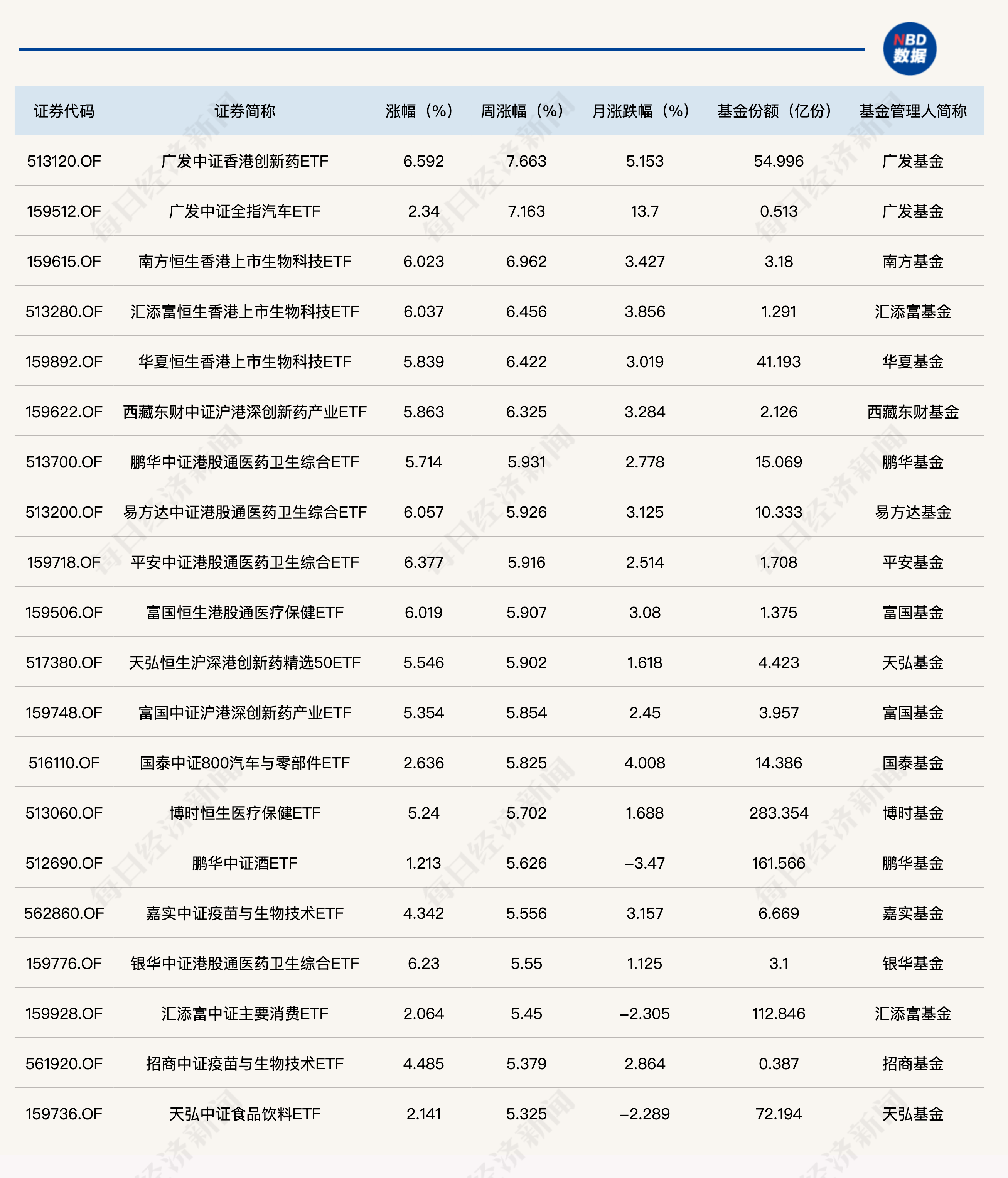 具体来看,本周ETF表现最好的产品是广发旗下的港股创新药ETF(513120),周涨幅高达7.66%。同类型的产品都表现不错,比如恒生生物科技ETF(159615)上涨6.96%,恒生医药ETF(159892)上涨6.42%。此外,博时旗下恒生医疗ETF(513060)本周上涨5.7%,该产品份额规模高达283亿份,这也是本周赚钱效应最大的ETF产品。