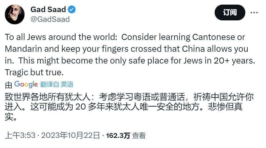 在日前,加拿大的一个犹太裔教授,加德·萨阿德,就当前巴以冲突局势发表看法。也不知道是不是基于当前国际舆论里的严重撕裂,大量民众开始反对以色列、反对犹太人。这个犹太裔教授呼吁世界各地的所有犹太人,尽快尝试学习中文,粤语和普通话都可以,然后就尝试去中国定居。因为未来的20多年里,可能中国对于犹太人来说,将是唯一一个安全的地方。
