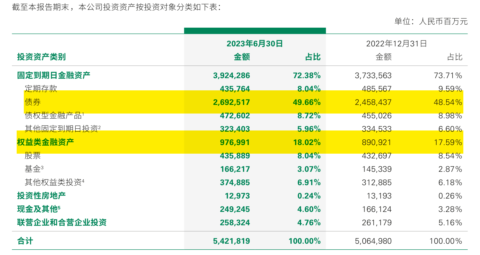 从中报披露的投资资产分布看,固定收益类资产在中国人寿投资结构中占超七成,其中49.66%为债券投资;股票、基金及其他权益类投资共占比18.02%,总规模约9770亿元,其中约4360亿投向了股票市场。