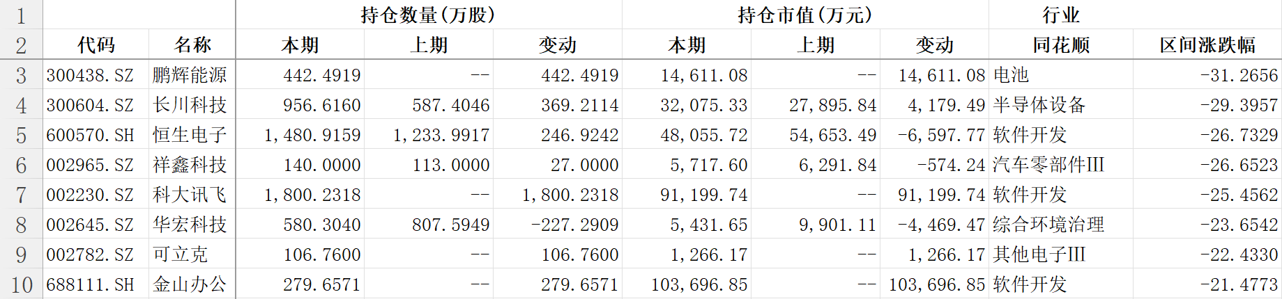 回落幅度最大的为锂电池制造商鹏辉能源,季度跌幅超30%;此外,长川科技、恒生电子、祥鑫科技、科大讯飞的跌幅也在25%以上。