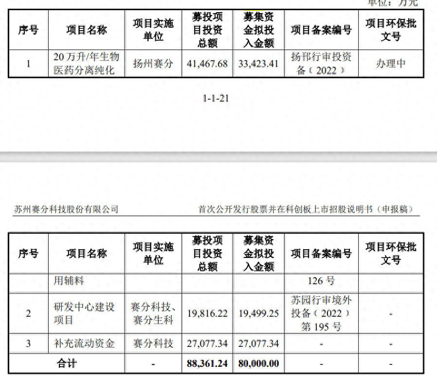 此次,赛分科技拟冲刺上交所科创板上市,拟募资总金额8.0亿元,保荐机构为中信证券(600030),募集资金拟用于20万升/年生物医药分离纯化用辅料、研发中心建设项目及补充流动资金。