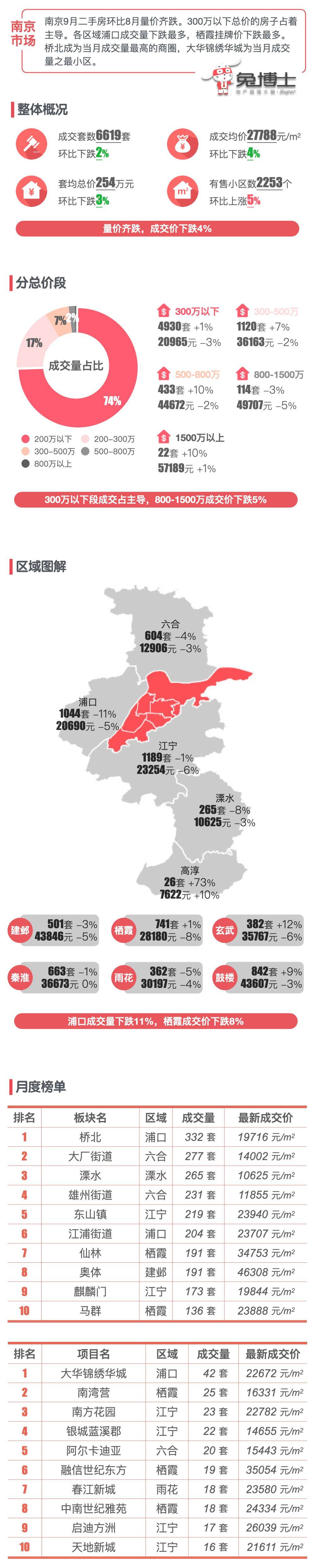南京9月二手房环比8月量价齐跌。300万以下总价的房子占着主导。各区域浦口成交量下跌最多,栖霞挂牌价下跌最多。桥北成为当月成交量最高的商圈,大华锦绣华城为当月成交量之最小区。