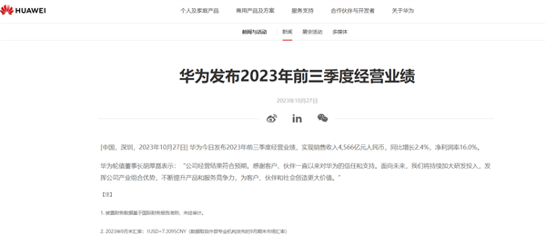 快科技10月27日消息,从华为官网获悉,华为今日发布2023年前三季度经营业绩。
