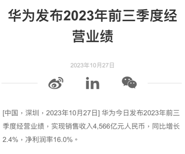 驱动中国2023年10月27日消息,华为今日发布2023年前三季度经营业绩,实现销售收入4,566亿元人民币,同比增长2.4%,净利润率16.0%。