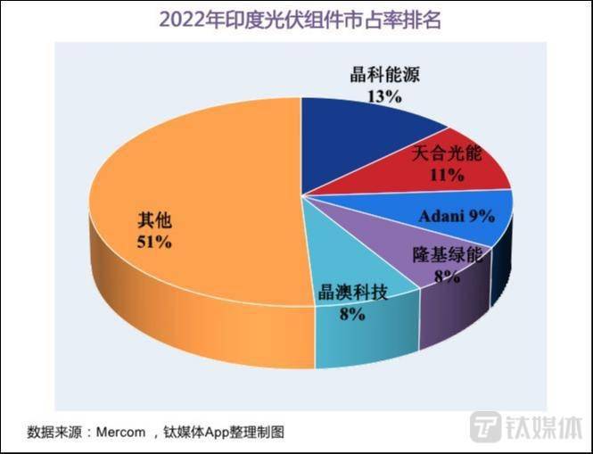 相关报道还称,此次调查涉及天合光能、隆基绿能等头部企业。根据Mercom公布的2022年印度光伏组件市场情况,我国组件龙头晶科能源、天合光能、隆基绿能、晶澳科技与印度本土企业Adani New Industries一并排在前五名。钛媒App通过多种渠道联系了上述企业,求证相关信息,截至目前,隆基绿能已确认在调查名单中,其他公司表示未接到相关通知或暂未回应,隆基绿能、晶澳科技同时强调,公司目前在印度业务进展正常。