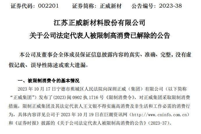 对此,正威新材(002201)10月19日公告,10月17日宁德市蕉城区人民法院向深圳正威(集团)有限公司发布了《限制消费令》,对正威集团采取限制消费措施,限制正威集团及其法定代表人王文银不得实施高消费及非生活和工作必需的消费行为。