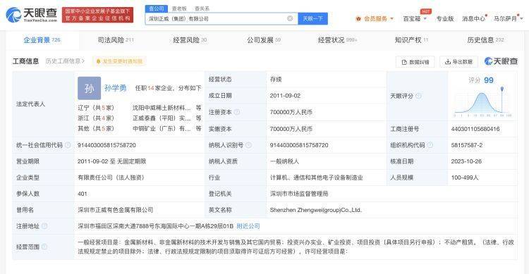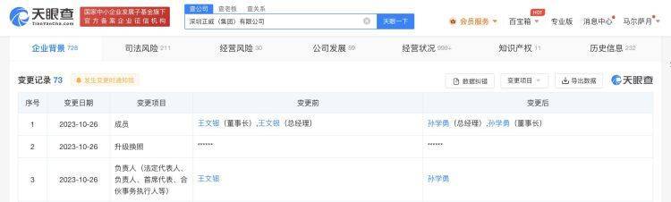 天眼查App显示,近日,深圳正威(集团)有限公司发生工商变更,王文银卸任法定代表人、董事长、总经理,由孙学勇接任。该公司成立于2011年9月,注册资本70亿人民币,经营范围含金属新材料、非金属新材料的技术开发与销售及其它国内贸易等,由正威控股集团有限公司全资持股。