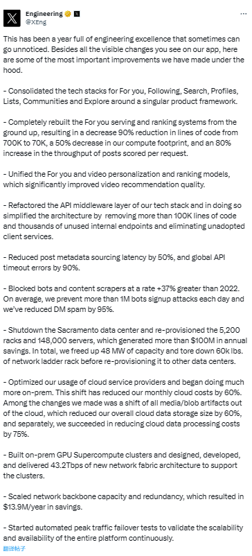今日,X 平台官方公布了年度开发总结,展示了一年来在后台方面的改进,并自夸为“工程卓越的一年”。IT之家附内容如下:
